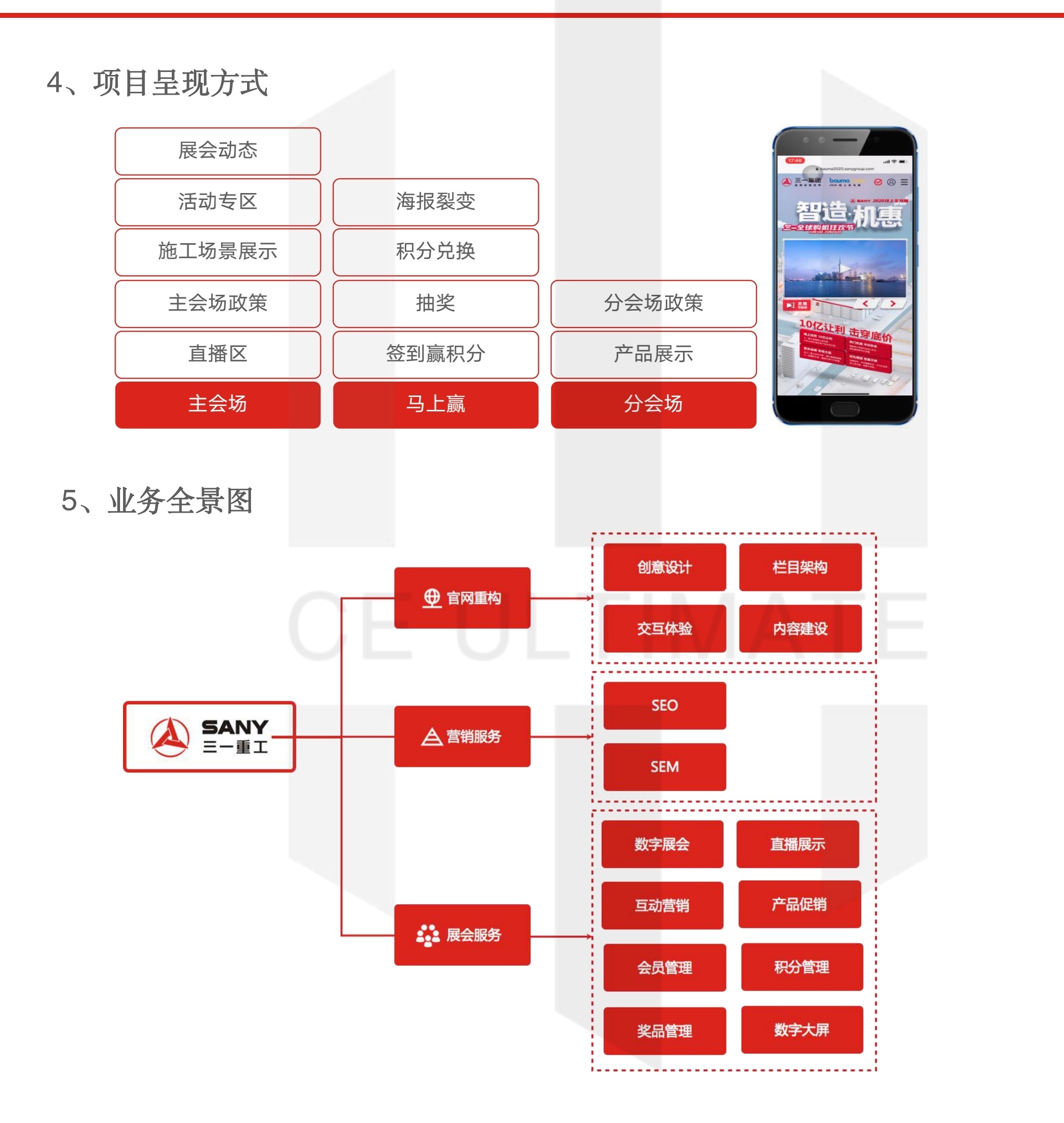 根據(jù)三?一集團(tuán)平臺(tái)的營(yíng)銷戰(zhàn)略略及模式進(jìn)?行行整體規(guī)劃,結(jié)合國(guó)際展會(huì)及線上數(shù)字營(yíng)銷需求,構(gòu)建?一個(gè)符 合三?一集團(tuán)寶?馬展會(huì)的綜合數(shù)字營(yíng)銷平臺(tái),該平臺(tái)對(duì)展會(huì)線上數(shù)字介質(zhì)進(jìn)?行行全?面系統(tǒng)的管理理,包括 線上寶?馬展專題站、積分體系建?立及應(yīng)?用、線上營(yíng)銷體系及應(yīng)?用、獎(jiǎng)品管理理、電商體系互動(dòng)、現(xiàn)場(chǎng)抽 獎(jiǎng)互動(dòng)、數(shù)字?大屏、線上營(yíng)銷體系,以及各種電商等接?口對(duì)接,通過線上商城、微信平臺(tái)等全?網(wǎng)銷售營(yíng)銷 渠道,實(shí)現(xiàn)國(guó)內(nèi)地區(qū)的良好運(yùn)轉(zhuǎn),建?立?一套相對(duì)完備的集數(shù)字營(yíng)銷、展會(huì)營(yíng)銷、會(huì)員收錄與激活、產(chǎn)品促 銷、積分管理理、線上互動(dòng)營(yíng)銷等于?一體的展會(huì)數(shù)字營(yíng)銷管理理平臺(tái),同時(shí)也為三?一集團(tuán)在未來(lái)線上展會(huì)和 數(shù)字營(yíng)銷規(guī)劃中打下良好的基礎(chǔ)。
