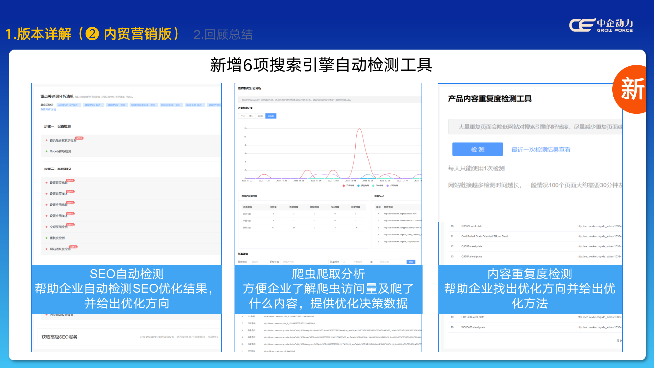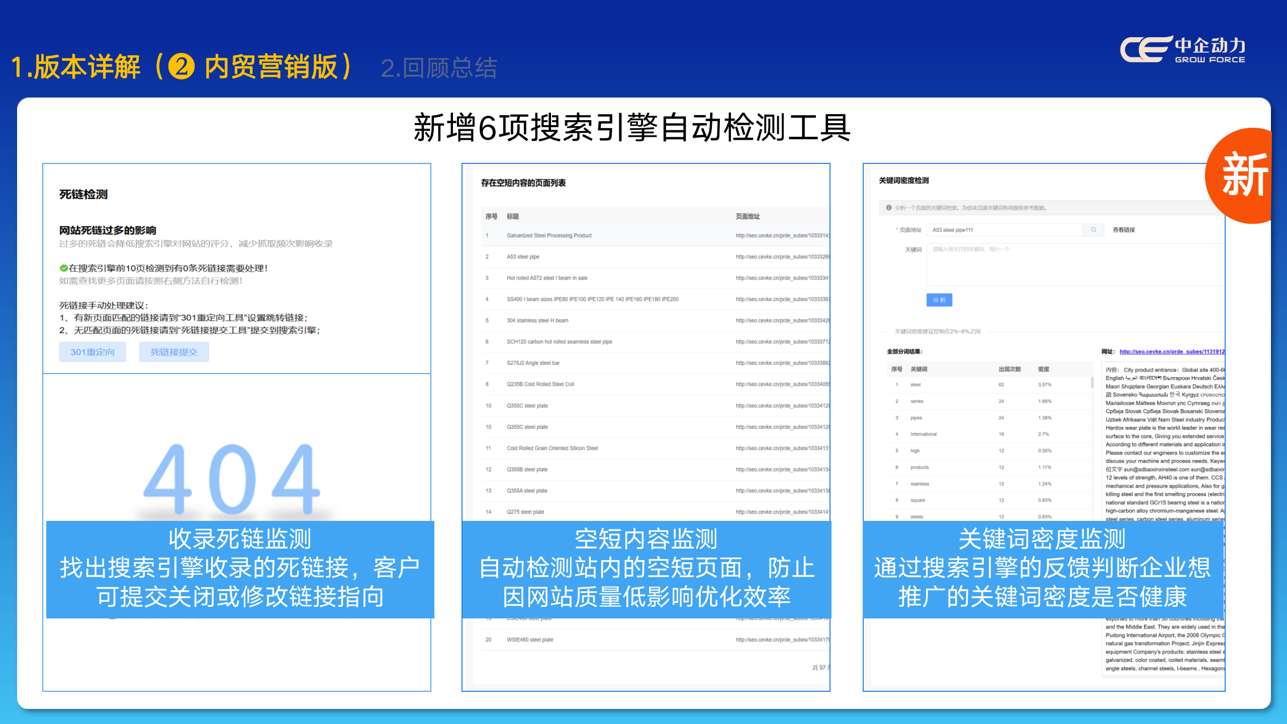 搜索引擎優(yōu)化工具 :① 死鏈提交 ② 網(wǎng)址重定向 ③ 自定義URL ④ SEO檢測 ⑤ 內(nèi)頁快速收錄 ⑥ 頁面抓取標(biāo)記 ⑦ 蜘蛛抓取分析 ⑧ 關(guān)鍵詞密度 ⑨ 重復(fù)度檢測 ⑩ SEO分析